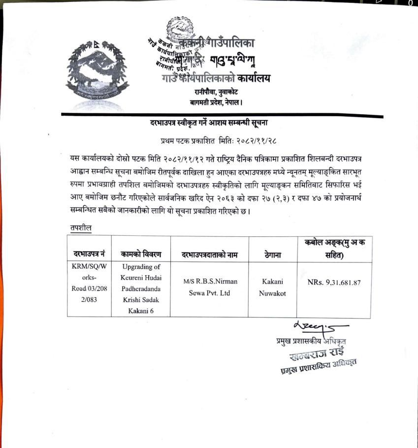 बोलपत्र स्वीकृत गर्ने आशयको सूचना !