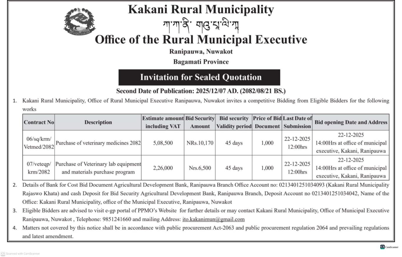 बोलपत्र आह्वान गरिएको सम्बन्धमा ।