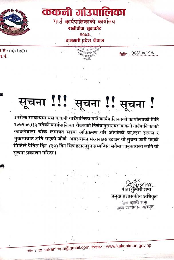 अव्यवस्थित टहरा हटाउने समबन्धि अत्यन्तै जरूरी सुचना