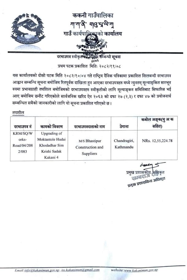 ठेक्का स्वीकृत गर्ने आशयको सूचना !